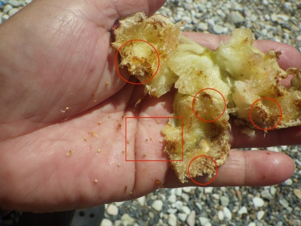 【左】解体。赤丸辺りの"花"からのタネを手のひらにくっつけた 【右】左写真の赤四角枠の部分を拡大した画像