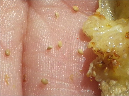 それを見て、「"タネ"でも確認してみようか」と思いつき、誰も採らないショボクレタその実を取って、玄関前に腰を下ろしてその実を解体した。