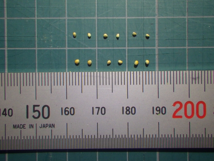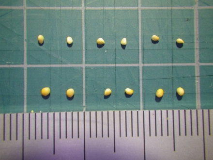 【左】小さめのタネは成熟途上のモノと推測 【右】長さは1mm以上だが、厚みは1mm未満と推測 (1目盛り:1mm)
