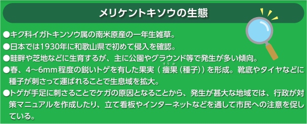 【左】隣の公園内の雑草の中でのメリケントキンソウ。白い部分が "花→種子" の部分