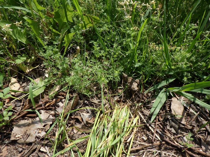 【上】背の高い雑草内で生えていたメリケントキンソウは12〜3cmに育っていた