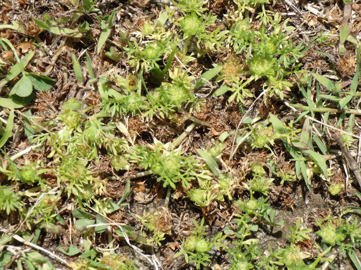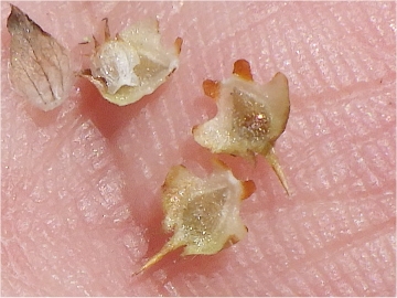 【右】まだ未成熟なメリケントキンソウの種子&トゲ。掌紋間隔からして1ヶの大きさは3.5mm前後