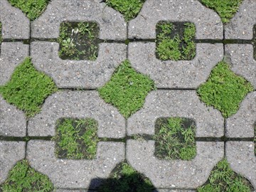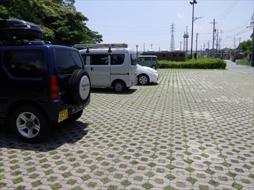 【左】鹿狩池西側駐車場。幾何学模様は下図のブロックのため。四角いマスは土で雑草が生える場所